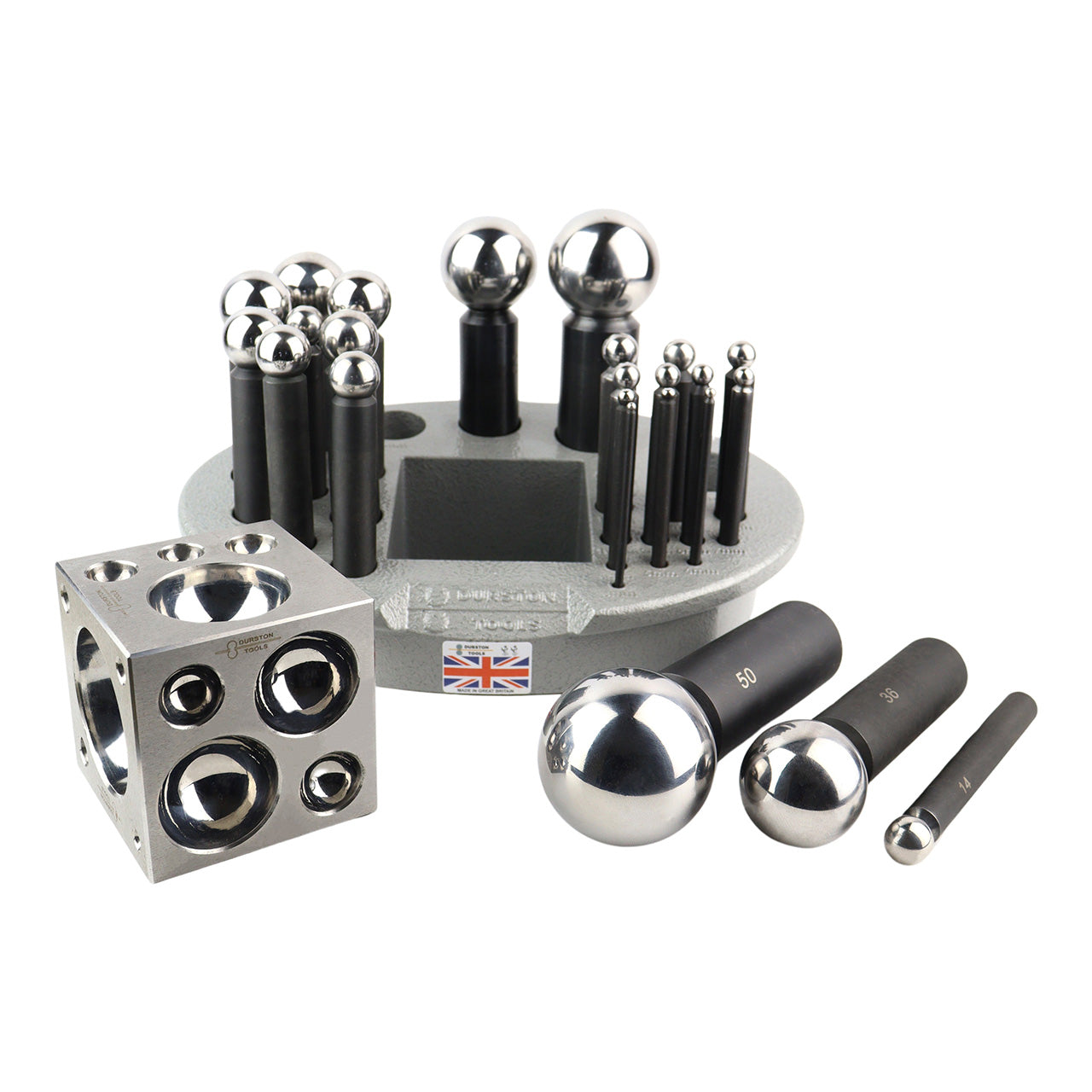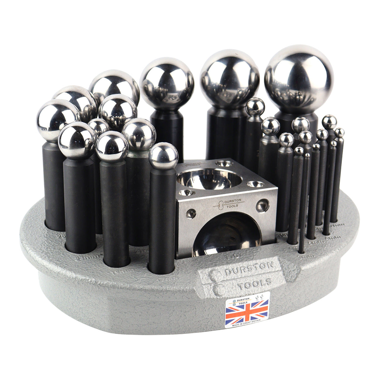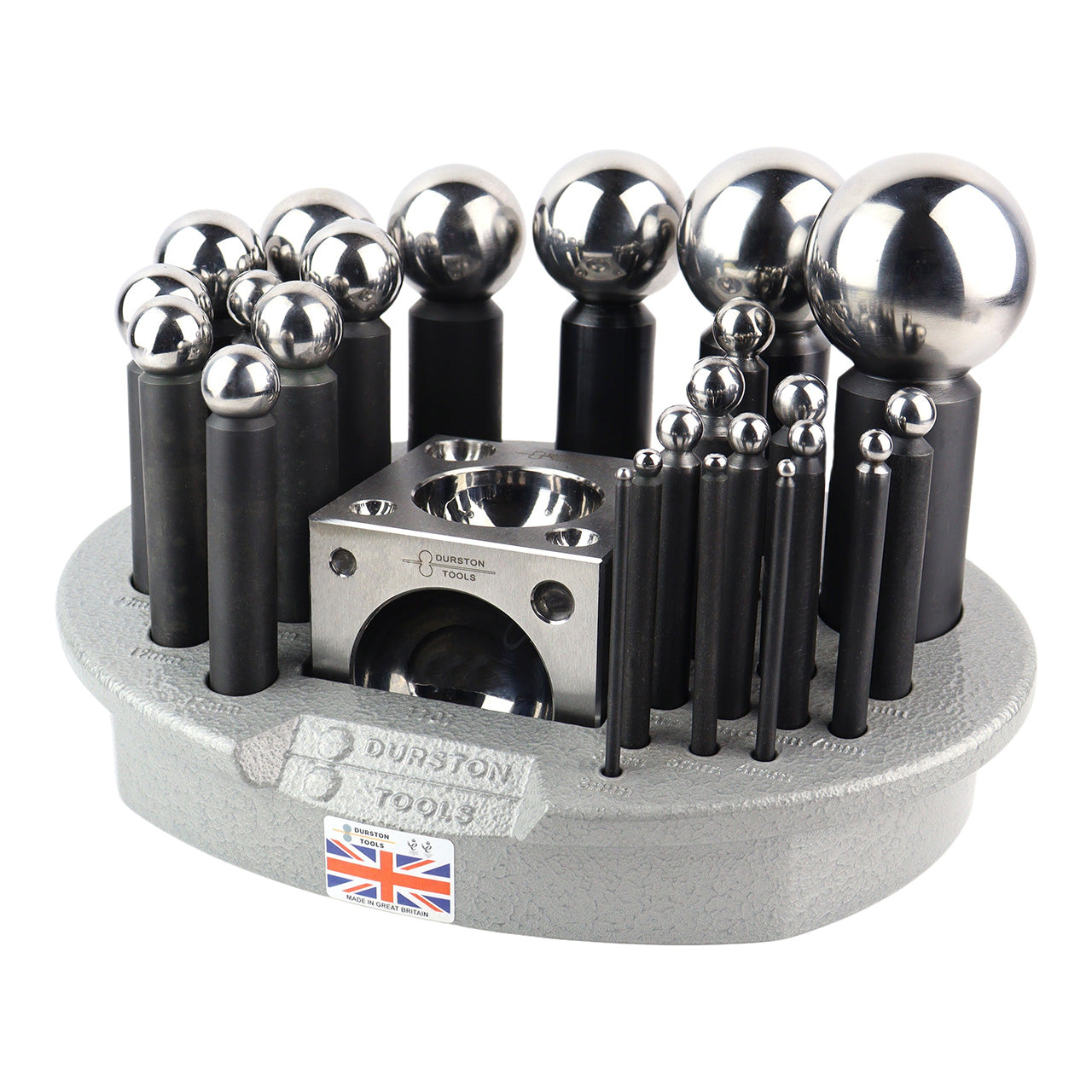 The Large Durston Dapping Set is perfect for the Professional Jeweler or Designer. Set consists of 24 punches (3, 4, 5, 6, 7, 8, 9, 10, 11, 12, 13, 14, 15, 17, 19, 21, 23, 25, 28, 32, 36, 40, 45, 50) and a matching 70mm dapping block. Durston steel sets are hardened, ground and polished to the highest quality and come complete in a unique plastic carrying case. Made in UK.