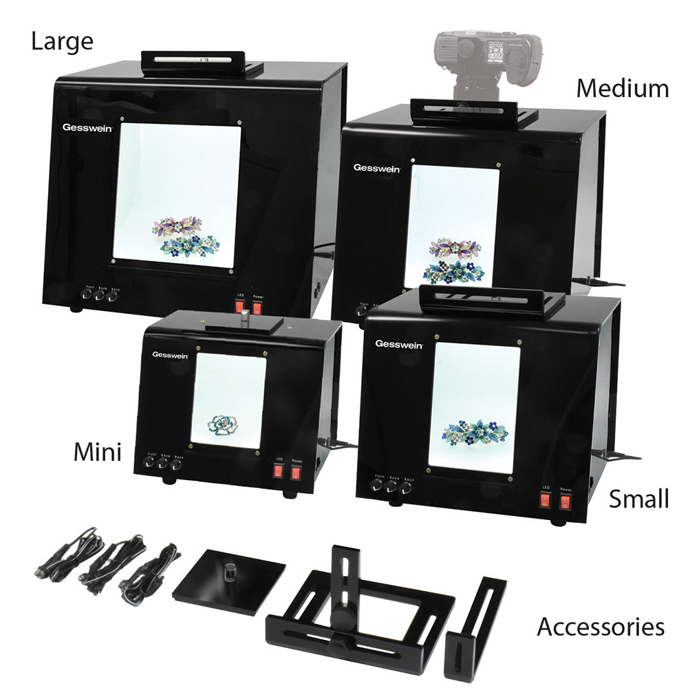 Designed for use at home, in the workshop or wherever digital photos are needed, the Gesswein Photo Imaging boxes offer a controlled lighting atmosphere to produce the highest quality digital photos, your jewelry will jump out and sell themselves! Whether you need photos for advertising, catalogs, website or logging repair intake; natural wrap-around lighting is the key to bringing out the best in all your images thus bringing in sales. Easy to use, one rocker switch controls fluorescent lights (5000°K +/-10%) located in the front, base and back panels while another rocker switch controls the super bright LED light panel located at the top/front of the interior of the lightbox. Light Banks: 2-Front, 1-Base, 1-Back Color Temp: 5000K (+/- 10%)